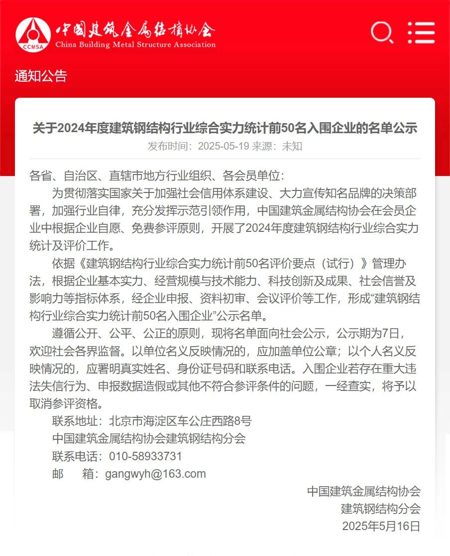 為貫徹落實(shí)國家關(guān)于加強(qiáng)社會(huì)信用體系建設(shè)、大力宣傳知名品牌的決策部署,加強(qiáng)行業(yè)自律,充分發(fā)揮示范引領(lǐng)作用,中國建筑金屬結(jié)構(gòu)協(xié)會(huì)在會(huì)員企業(yè)中根據(jù)企業(yè)自愿、免費(fèi)參評原則,開展了2024年度建筑鋼結(jié)構(gòu)行業(yè)綜合實(shí)力統(tǒng)計(jì)及評價(jià)工作。依據(jù)《建筑鋼結(jié)構(gòu)行業(yè)綜合實(shí)力統(tǒng)計(jì)前50名評價(jià)要點(diǎn)(試行)》管理辦法,遵循公開、公平、公正的原則,根據(jù)企業(yè)基本實(shí)力、經(jīng)營規(guī)模與技術(shù)能力、科技創(chuàng)新及成果、社會(huì)信譽(yù)及影響力等指標(biāo)體系,經(jīng)企業(yè)申報(bào)、資料初審、會(huì)議評價(jià)等工作,形成“建筑鋼結(jié)構(gòu)行業(yè)綜合實(shí)力統(tǒng)計(jì)前50名入圍企業(yè)”公示名單。